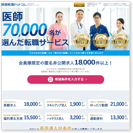 医師転職ドットコムのおすすめポイント70,000名以上の医師が選んだ転職サイト。 求人数は業界最大級の44,000件以上以上。 平均年収アップ率122.8%を実現。 サイト総合満足度95.3%と納得の対応とサポート。 |
