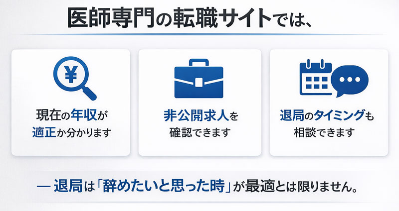 その比較材料を集める方法として、医師専門の転職支援サービスが活用されています。